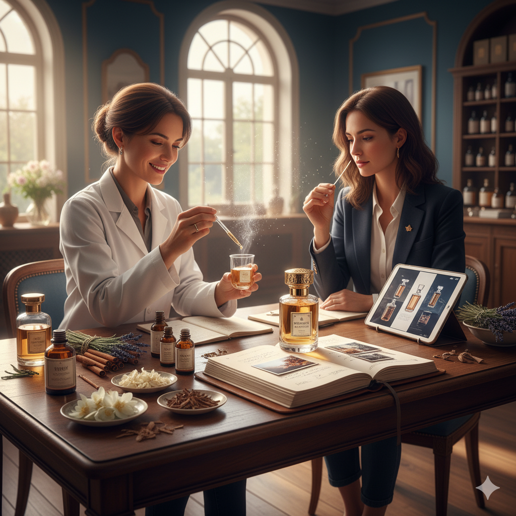 - Consultation olfactive : Échange avec un parfumeur pour capturer vos goûts, inspirations et souvenirs.